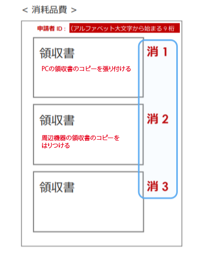 また、手元に保管する領収証のコピーに関しても、A4用紙に貼り付けた後、消1、消2など記入します。