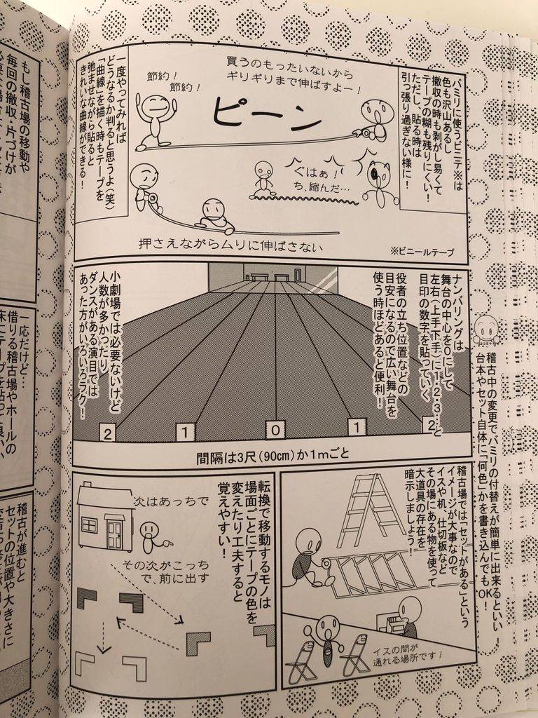 例えば、バミリ(テープの目印)についてのページでは、具体的なやり方、公演によってバミる目的などを解説。使うテープの種類など、細かい部分についても言及しています。